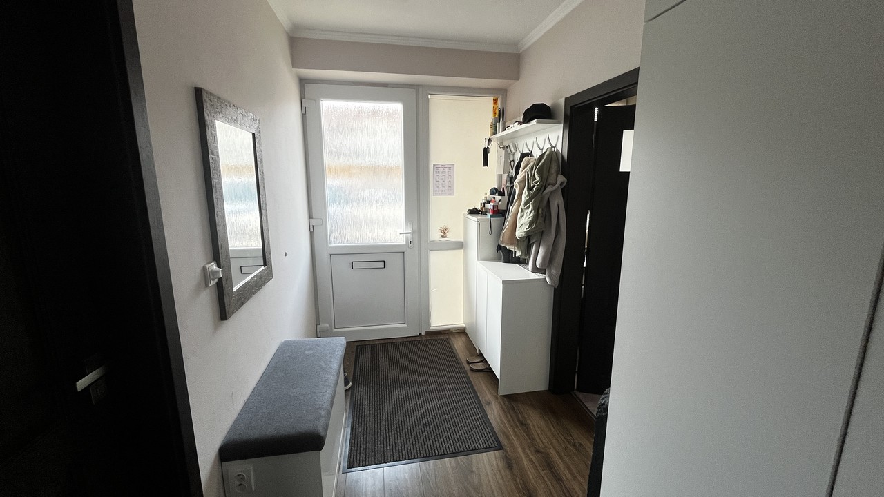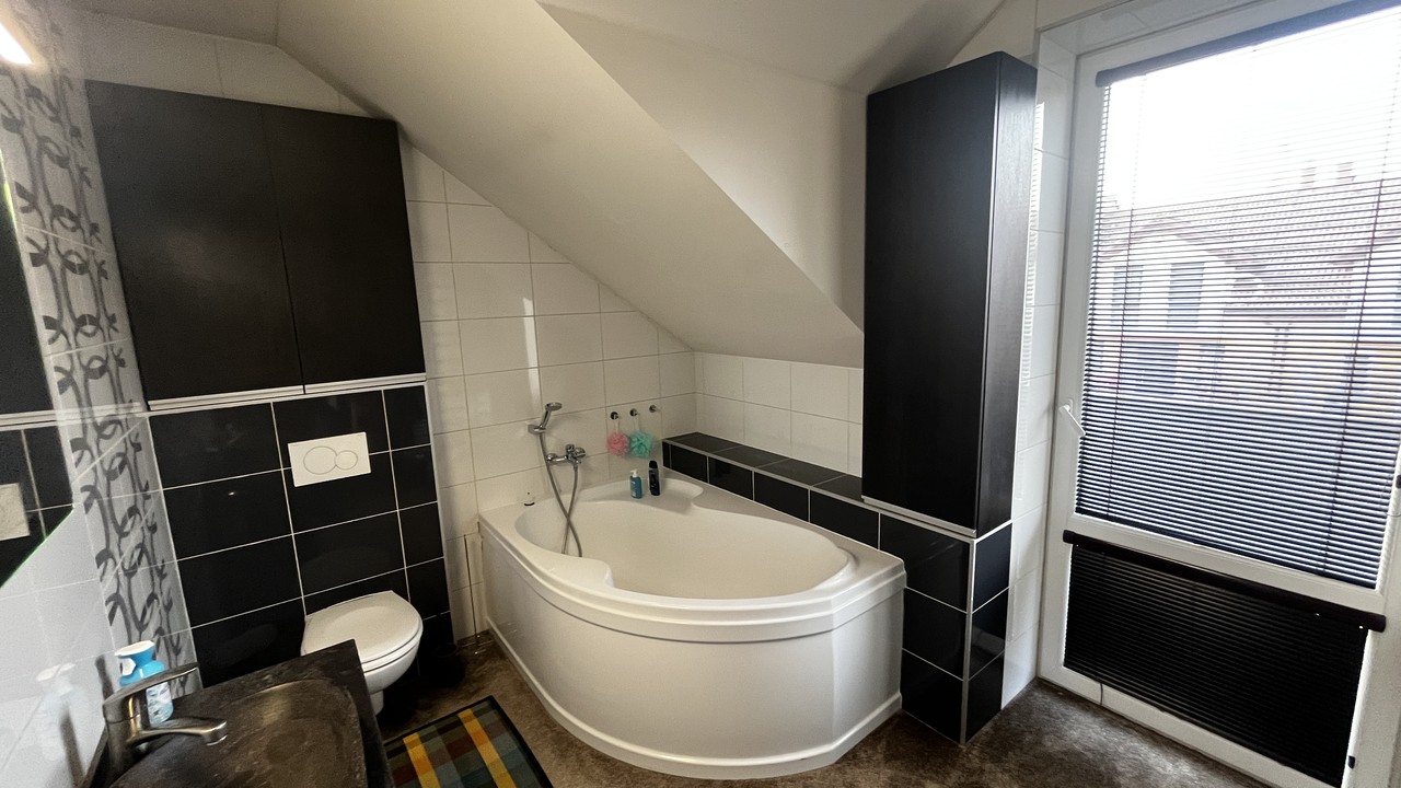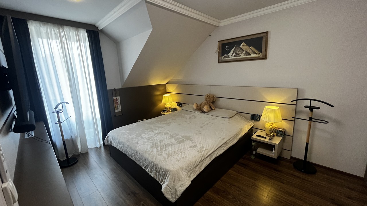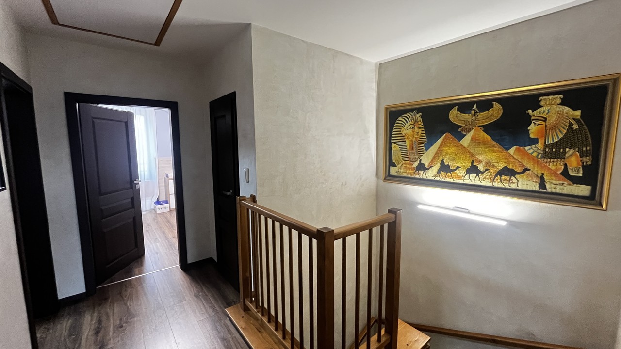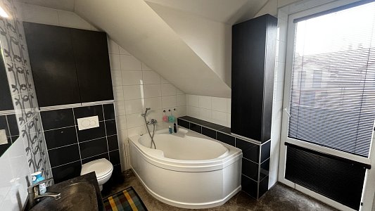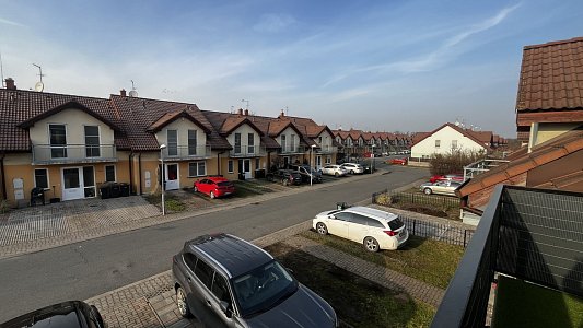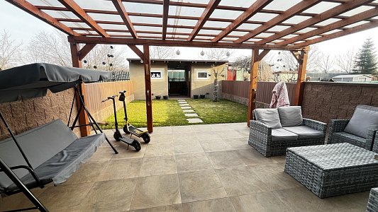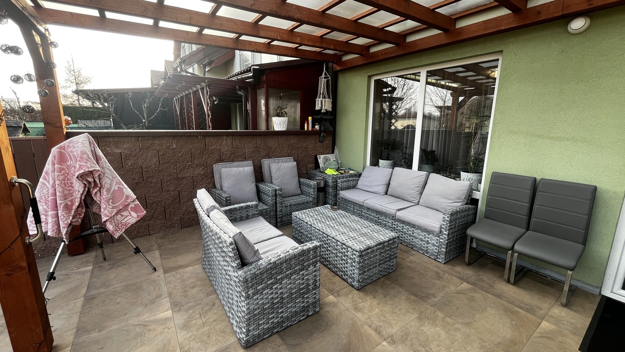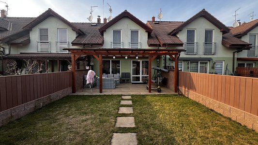 Francouzské okno propojuje interiér se zahradou a umožňuje pohodlný vstup na zastřešenou pergolu se zahradním nábytkem. Zahrada je rovinná, pečlivě udržovaná a kompletně oplocená, což z ní činí ideální místo pro odpočinek i rodinné chvíle. V horním patře se nachází tři samostatné pokoje, koupelna a technická místnost s kotlem. Z ložnice a koupelny je navíc přímý vstup na balkon orientovaný do ulice. Dispozice domu je navržena tak, aby poskytovala dostatek prostoru pro společné chvíle i potřebné soukromí každému členovi rodiny.